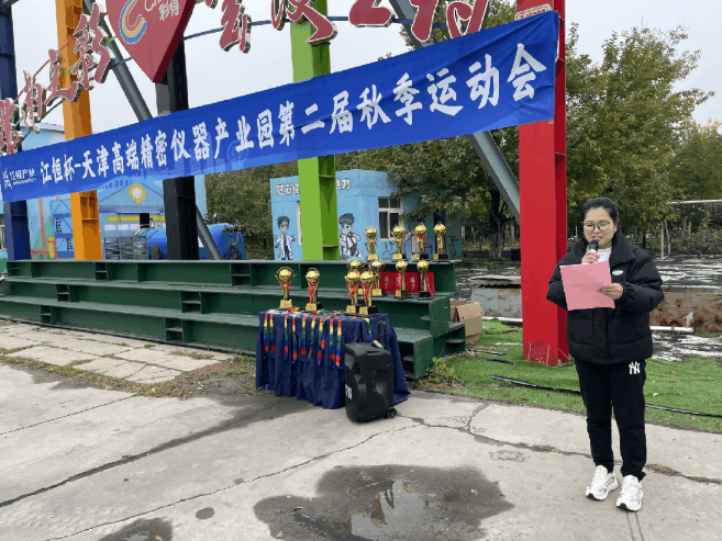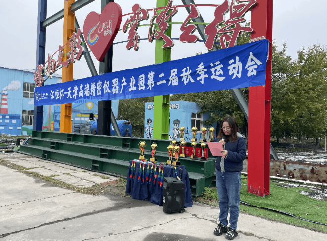 开幕式上,全体人员肃立奏唱国歌,庄重的旋律点燃了现场每个人的爱国情怀。随后,江恒产业-天津高端精密仪器产业园总经理李明山上台致辞,他表示:“运动会不仅是体育竞技的舞台,更是产教联合体成员凝聚情谊、共话发展的纽带,期待大家在赛场上赛出水平、赛出风采。”