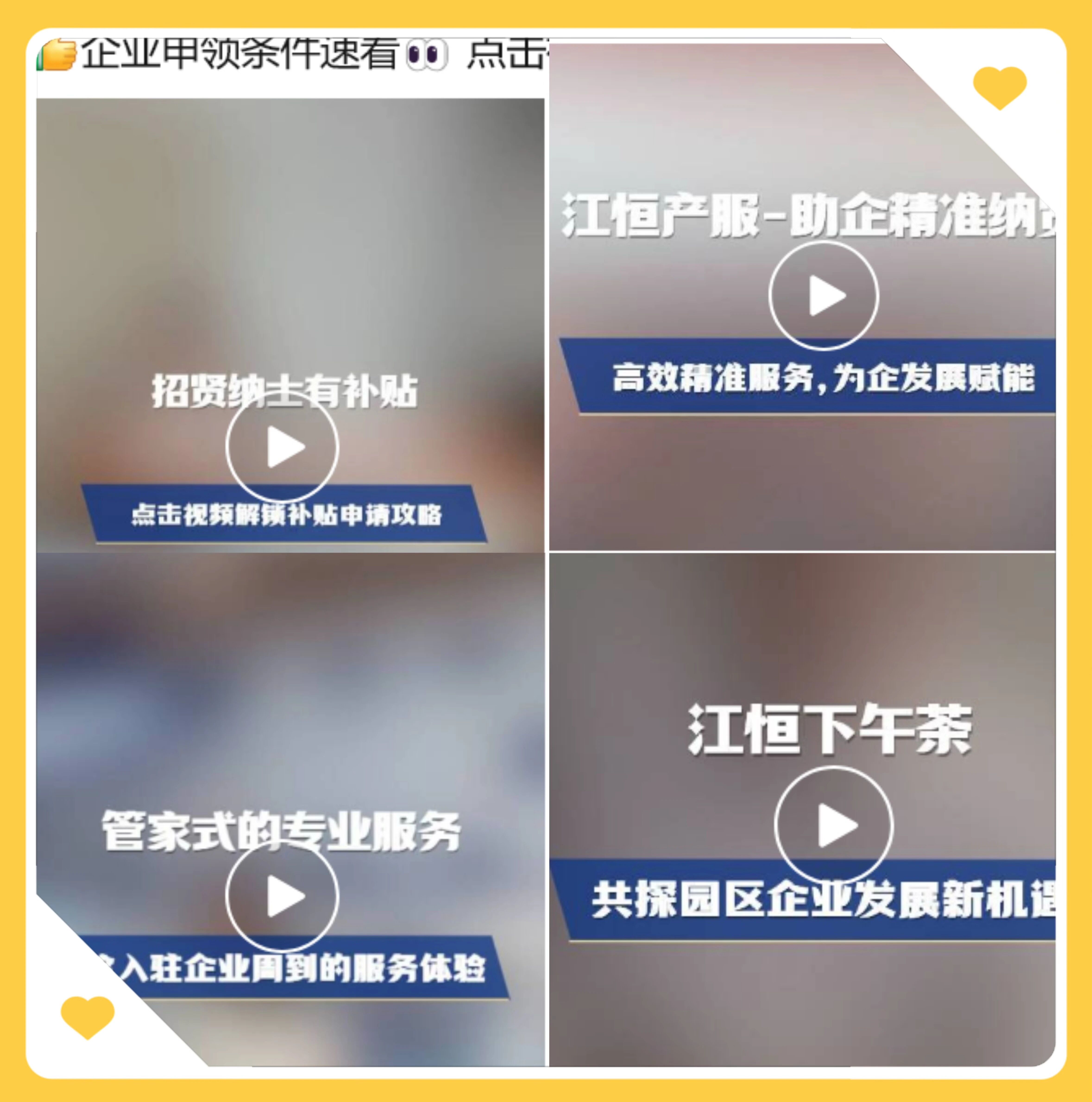 为讲好园区故事,提升品牌影响力,江恒产服通过“公众号+短视频”结合的方式进行宣传。全年在园区公众号发布推文85篇,内容涵盖政策解读、企业喜报、活动纪实等多个维度,展示园区及企业风采;制作发布产服主题短视频12条,以更直观、生动的形式展现产服服务成果。