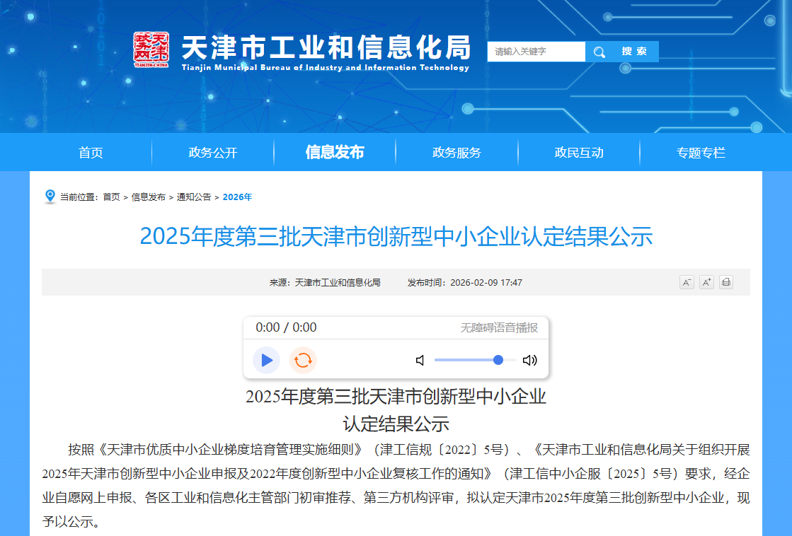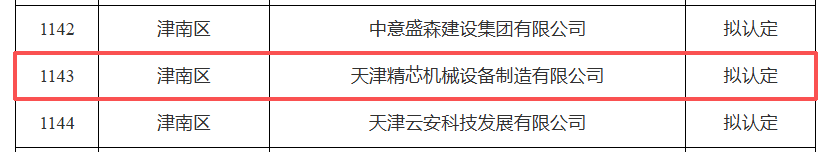 2026年2月9日,天津市工业和信息化局发布了2025年度第三批天津市创新型中小企业拟认定名单。热烈祝贺天津高端精密仪器产业园园区企业-天津精芯机械设备制造有限公司名列榜单!