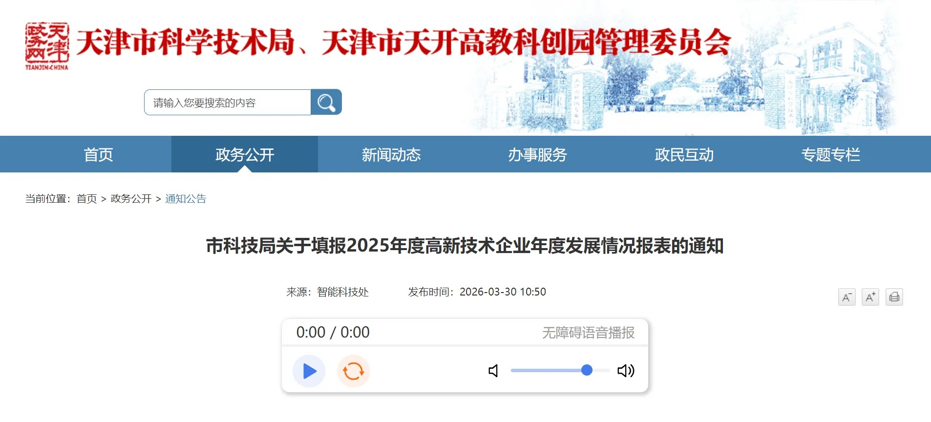 按照《高新技术企业认定管理办法》(国科发火〔2016〕32号)第十三条规定,“企业获得高新技术企业资格后,应每年5月底前在‘高新技术企业认定管理工作网’填报上一年度知识产权、科技人员、研发费用、经营收入等年度发展情况报表”。现就天津市有效期内高新技术企业填写“2025年度高新技术企业年度发展情况报表”有关事宜通知如下: